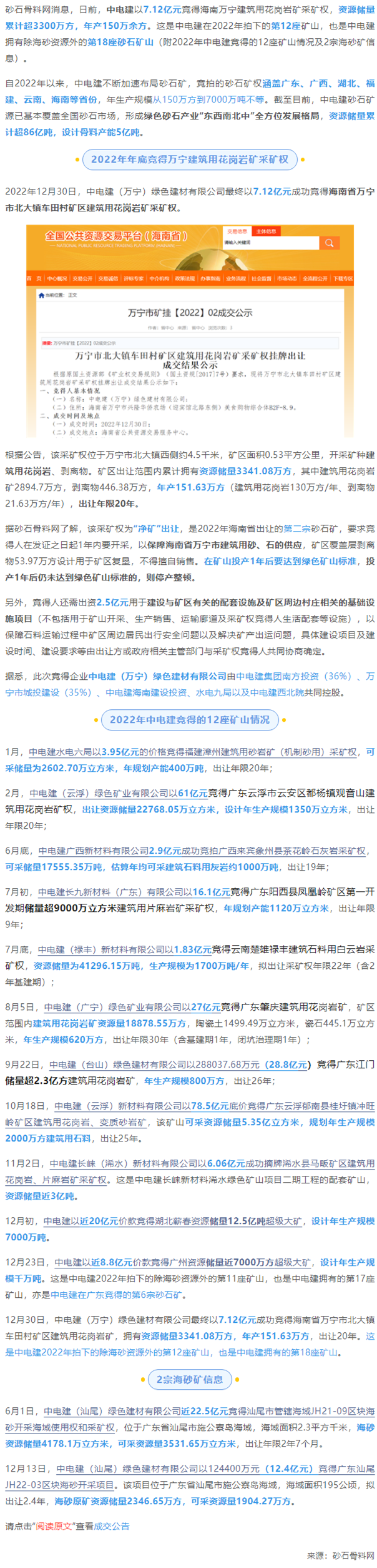 18座 | 7.12亿竞得海南储量超3300万方大矿 盘点2022年中电建砂石矿权